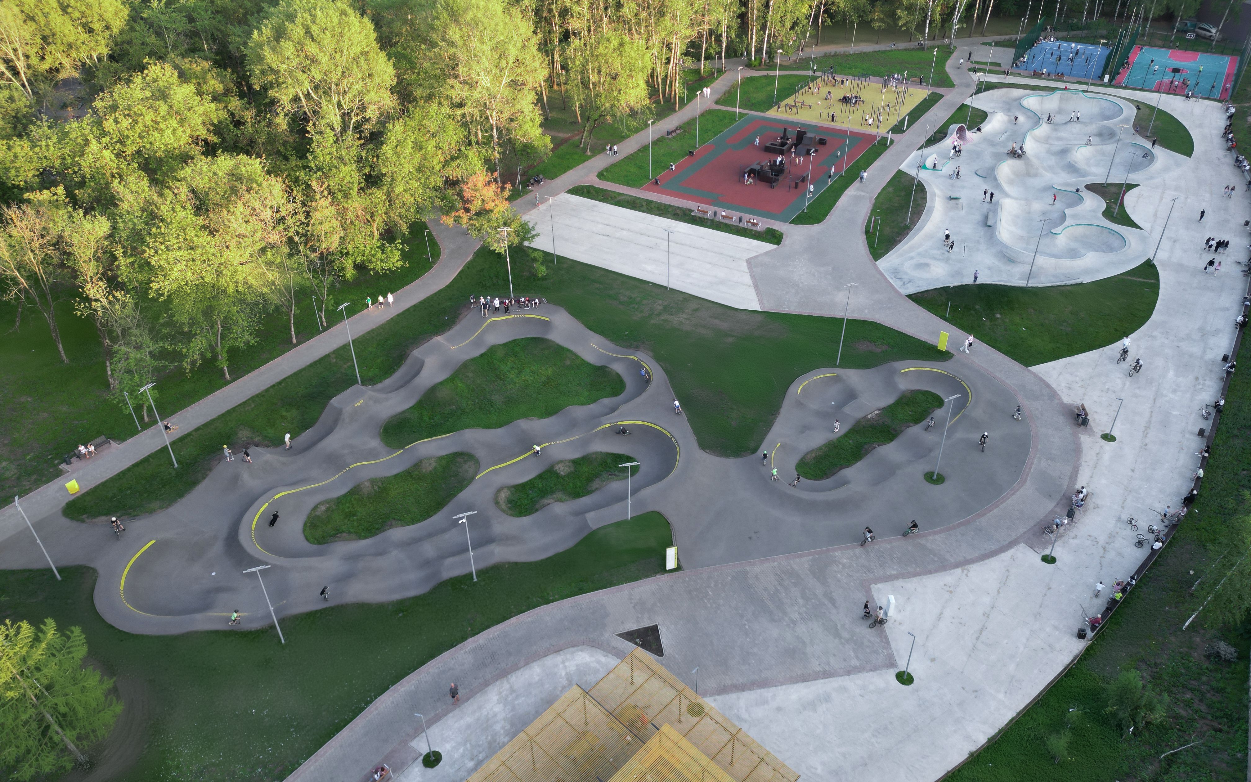 Экстрим-зона включает памп-трек для продвинутых райдеров площадью 450 м² и детский памп-трек, обеспечивая разделение зон катания для разных уровней, что способствует безопасности всех участников. Детский памп-трек обеспечивает безопасные условия для юных спортсменов, давая им возможность освоить базовые навыки катания.