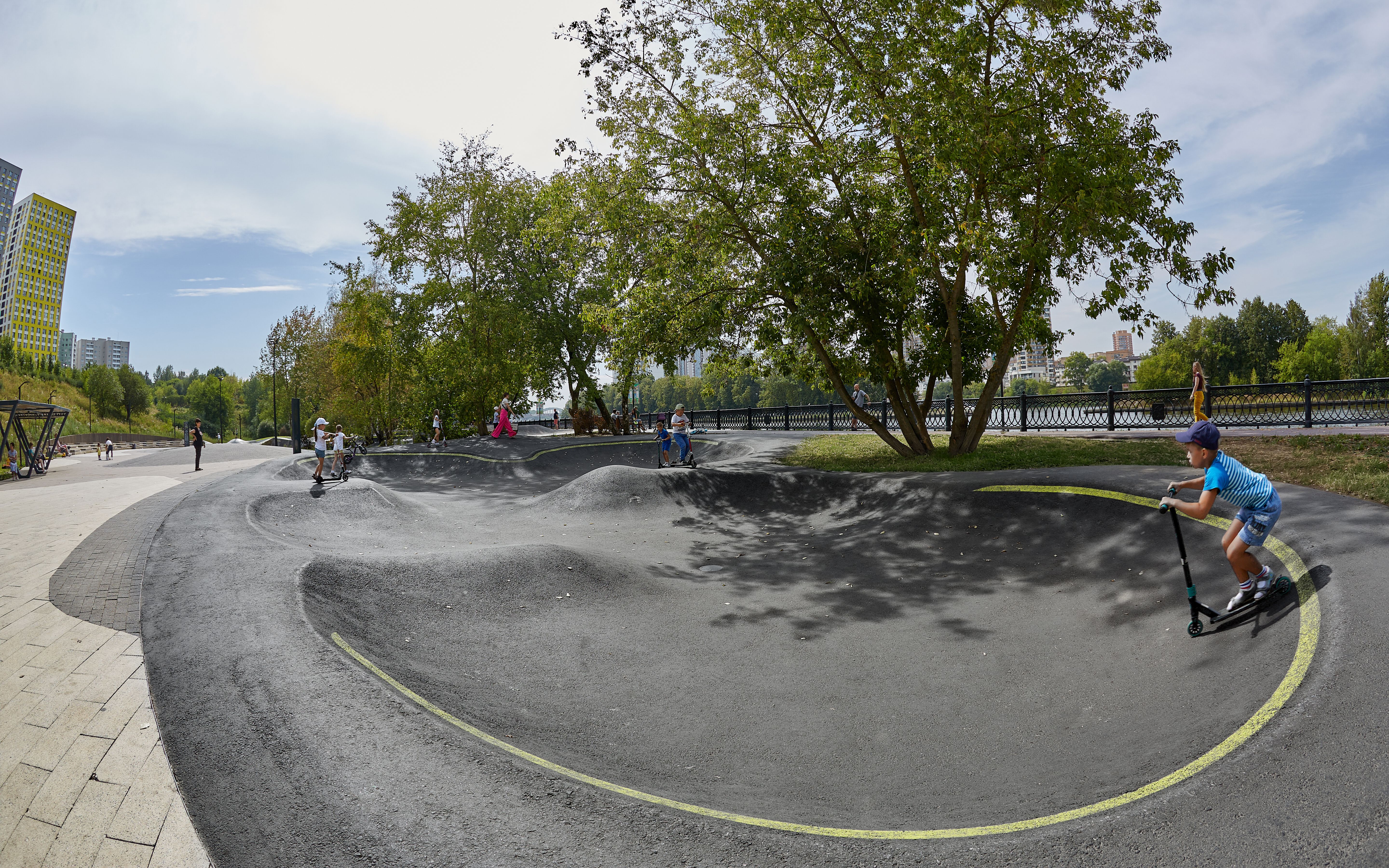 Парк "Экоберег", относящийся к категории L, включает скейт-парк, памп-трек и асфальтовый боул, что делает его идеальным местом для райдеров всех уровней. Скейт-парк оборудован фигурами для отработки трюков различной сложности, а асфальтовый боул является комфортной зоной для младших спортсменов. Важной частью парка является обширная общественная зона с перголой, амфитеатром и зонами отдыха, что делает его не только спортивным, но и семейным местом для встреч и отдыха.