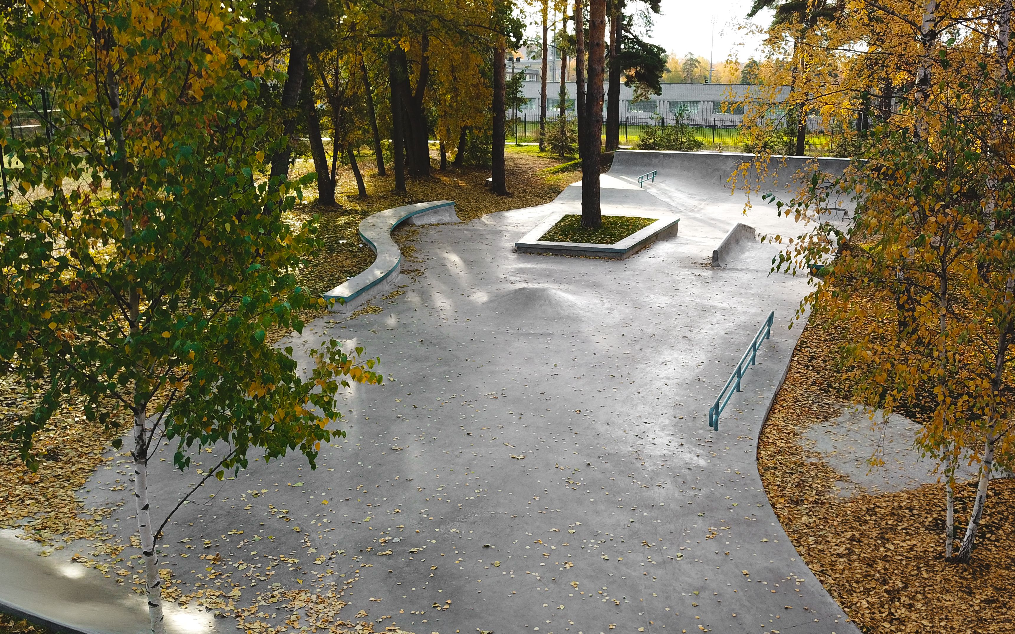 Скейт-парк гармонично вписан в природный ландшафт парка имени Урицкого. Территорию окружают высокие сосны и березы, которые создают естественную тень, сохраняя прохладу и комфорт в жаркое время дня. Архитектурные решения плавно сочетаются с окружающей природой, создавая баланс между современными спортивными зонами и естественной зеленью.